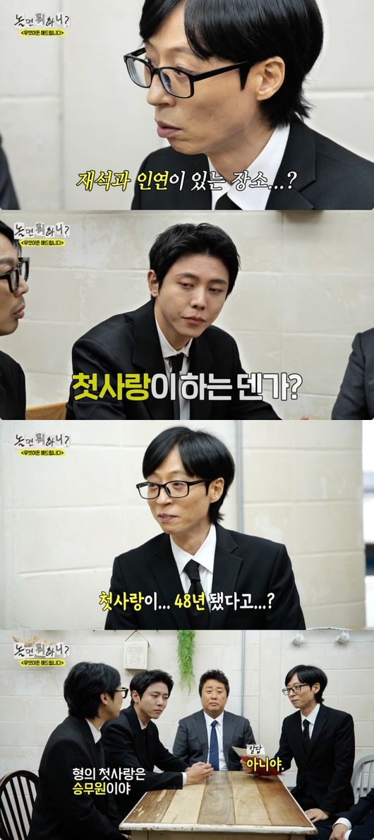 유재석은 “내 첫사랑이 태어나자마자…”라고 말끝을 흐렸고, 이에 하하는 “그리고 형의 첫사랑은 승무원이다”라고 강제 폭로했다.