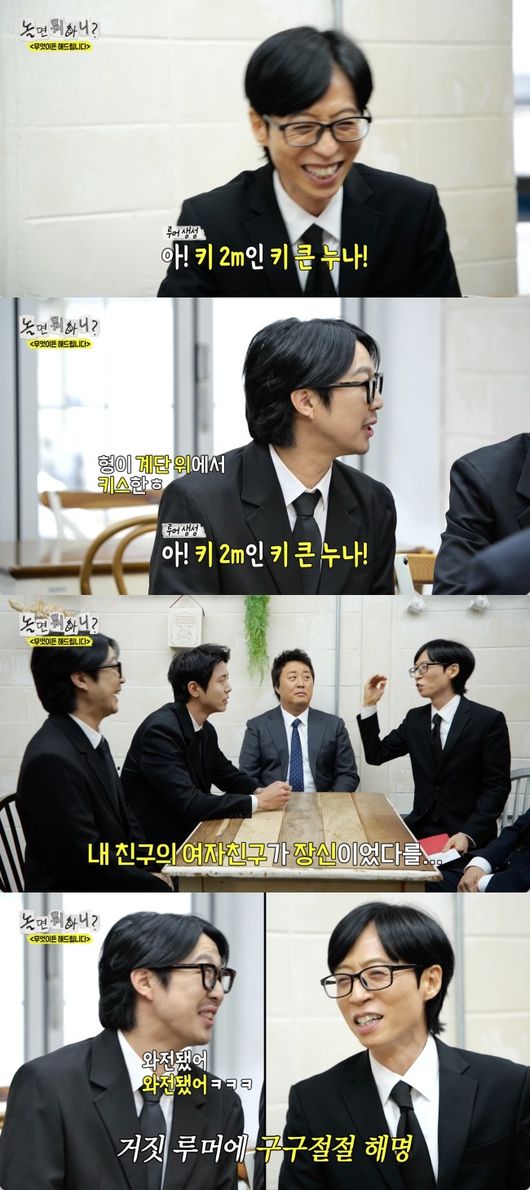 유재석은 다시 한 번 “아니다”라고 강조했고, 하하는 “아 키 2m인 그 누나. 계단 위에서 키스한”이라고 덧붙였다. 이에 유재석은 “내 친구의 여자친구가 장신이었다를 몇 년 지나니까 내 여자친구가 2m로”라고 하하의 거짓 폭로를 밝혀 웃음을 줬다.
