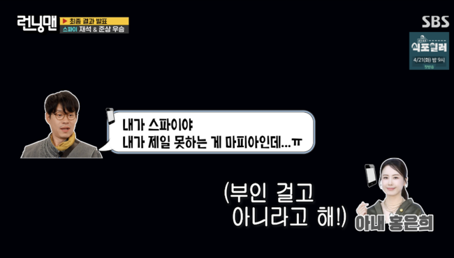 이에 대해 유준상은 “아내에게 아까 통화했다 힘든거니까 ‘나를 걸어요’ 했다”며 아내 홍은희와 통화했다고 해명했다. 실제 “내가 스파이라 불안하다”는 유준상 말에 홍은희가 “부인걸고 아니라고 해라”고 통화한 모습이 그려지기도. 유준상은 “아내에게 허락받았다”며 오히려 본인 홍은희가 선제안한 것이라 강조했다.