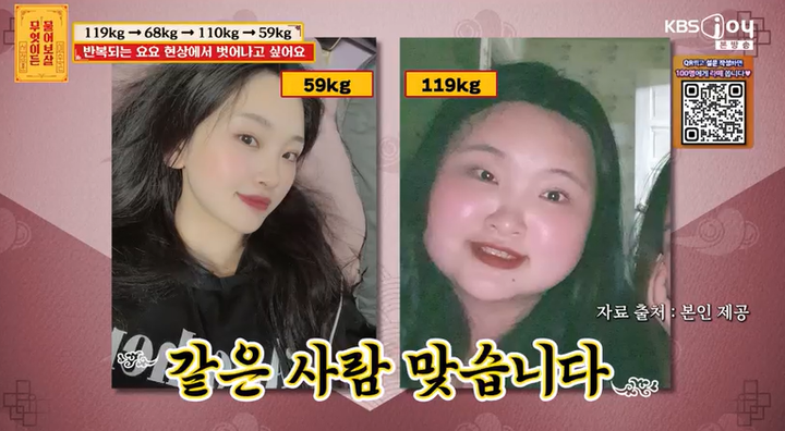 다이어트의 계기는 절실했던 '첫사랑'이었다. 모태솔로였던 사연자는 군 복무 중이던 썸남의 면회를 가기 위해 40kg을 감량했다. 하지만 이등병에서 병장이 된 상대를 찾아갔을 때 정작 그는 사연자의 친구에게 관심이 있었고, 용기 낸 고백마저 거절당했다는 안타까운 사연을 전했다. 이후 남자친구를 사귀며 다시 살이 올랐고, 두 번째는 양약의 도움을 받아 59kg까지 뺐으나 결국 요요를 피하지 못했다.