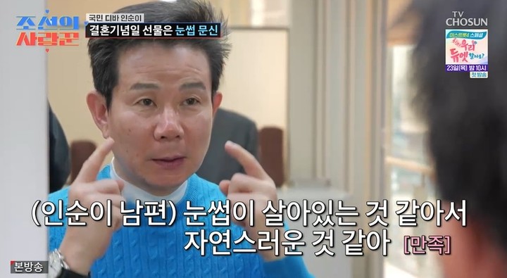 시술대에 오른 남편은 잔뜩 긴장한 기색이 역력했으나, 시술 직후 고통 없이 완성된 자연스러운 눈썹을 거울로 확인하고는 어린아이처럼 기뻐했다. 남편은 "너무 마음에 든다"며 대만족했고, 인순이 역시 남편의 밝아진 인상에 뿌듯함을 드러내며 32년 만의 첫 이벤트를 성공적으로 마무리했다.