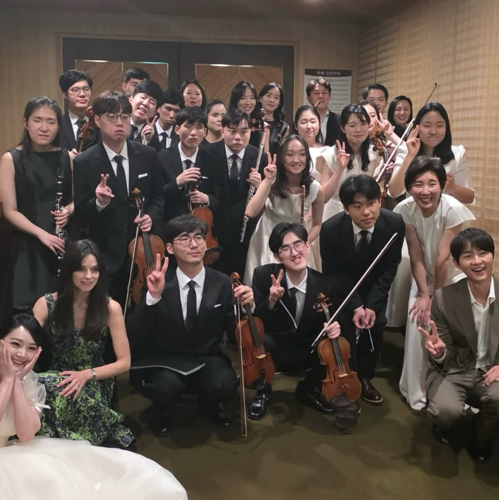 공개된 사진 속에는 송중기와 케이티가 김소현을 비롯해 지난 18일 서울 예술의전당 IBK챔버홀에서 열린 가온 솔로이스츠 제7회 정기연주회 연주자들이 나란히 모여 사진을 찍고 있다. 특히 김소현은 케이티 실물을 본 소감을 입틀막 포즈로 표현해 유쾌함을 자아냈다.