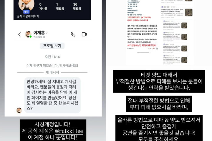 (MHN 윤우규 기자) 그룹 쿨(Cool) 출신 이재훈이 자신을 사칭한 계정과 함께 공연 티켓 불법 양도에 대해 직접 주의를 당부했다.