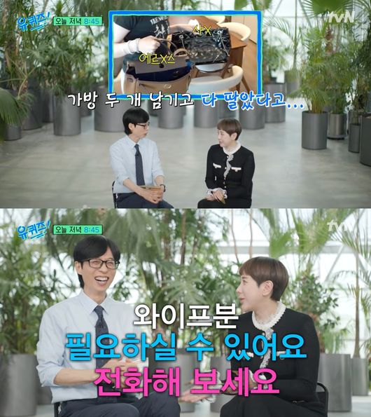 이런 가운데 유재석이 명품백 처분에 대해 묻자 "그렇다"고 수긍하면서 "살래요?"라고 유재석에게도 판매를 시도해 웃음을 자아냈다. 그는 "와이프 분 필요하실 수 있다. 전화해봐라"라며 "진짜 괜찮아요 상태는. A급이다"라고 유재석의 아내 나경은까지 언급하며 어필에 나서 폭소케 했다.