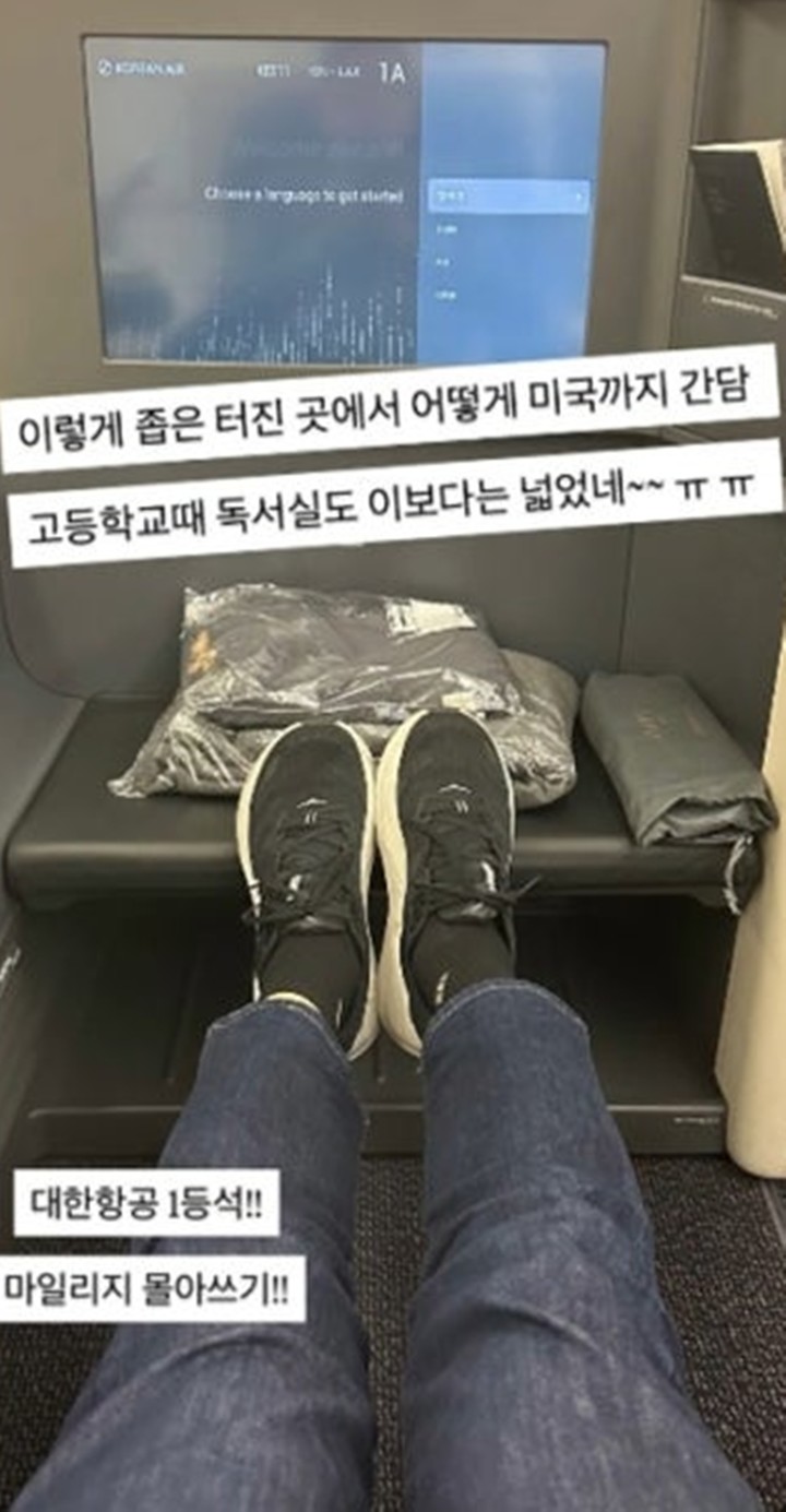 김영삼은 21일 자신의 계정에 "이렇게 좁은 공간에서 어떻게 미국까지 가라는 건지 모르겠다. 고등학교 때 다니던 독서실보다도 더 비좁다"라는 글을 남기며 "마일리지 몰아서 일등석을 이용했는데 기대와는 거리가 있다"는 반응을 덧붙였다. 함께 공개된 사진에는 미국행 비행기에 탑승한 그가 일등석 좌석에 앉아 내부를 촬영하는 모습이 담겨있었다.