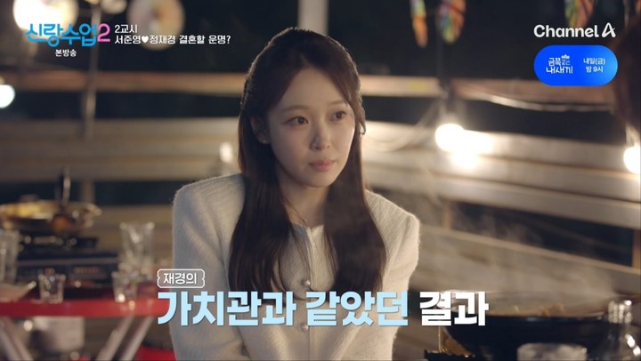 분위기가 무르익자 서준영은 다시 타로 이야기를 꺼냈다. 그는 결혼 가능성에 대한 결과를 언급하며 정재경의 생각을 물었고, 정재경은 "잘 맞는 사람이면 빠르게 결혼까지 갈 수 있다고 생각한다"고 솔직한 가치관을 밝히면서 "상대가 누구냐의 문제는 아니다"라고 괜한 말을 덧붙였다.