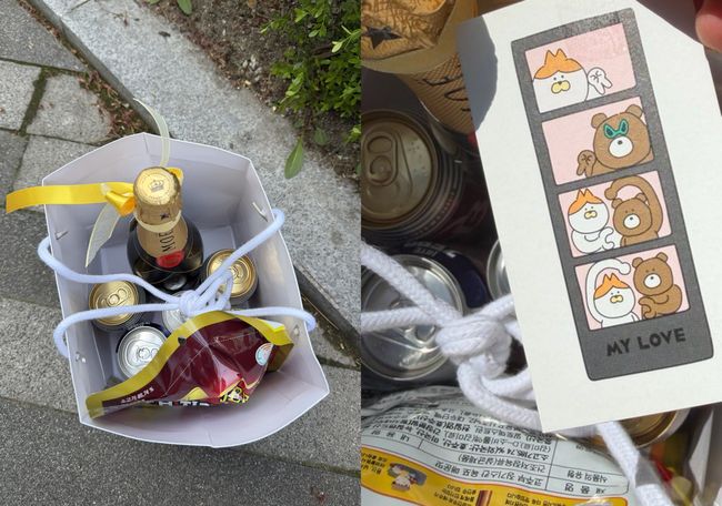 해당 팬은 염혜란이 건네준 것으로 보이는 쇼핑백 사진을 찍어 올렸다. 쇼핑백 내부에는 다양한 종류의 캔맥주와 샴페인, 안주용 육포가 담겨 있어 눈길을 끈다.