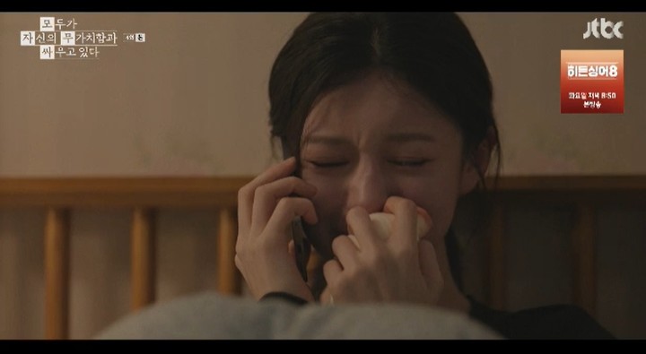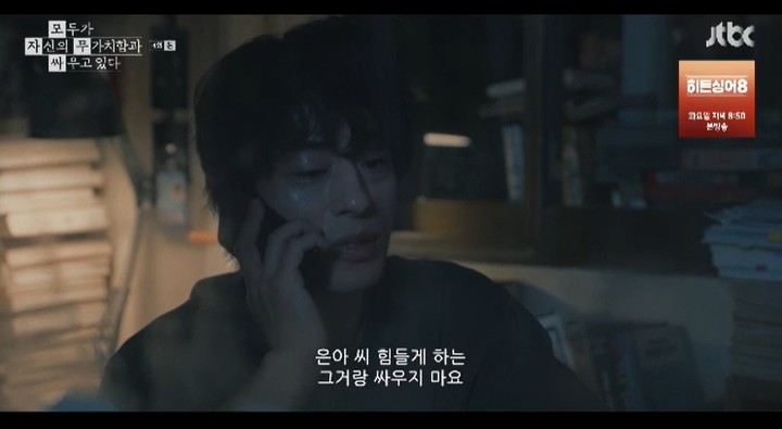 압권은 한밤중 이어진 두 사람의 전화 통화였다. 코피를 쏟으며 무너져 내리던 은아는 동만에게 전화를 걸었다. 동만은 자신이 겪은 가위눌림을 예로 들며 위로를 건넸다. "상대할 게 있고, 상대하지 말아야 할 게 있더라고요. 은아 씨 힘들게 하는 그거랑 싸우지 마요. 가위 같은 거예요. 그냥 지나가게 둬요" 이 투박한 한마디는 은아의 코피를 멈추게 했고, 동시에 동만이 시나리오 면접에서 쏟았던 눈물의 의미를 해소해주었다. 각자의 무가치함과 싸우던 두 사람이 서로의 상처를 보듬어준 순간이었다.