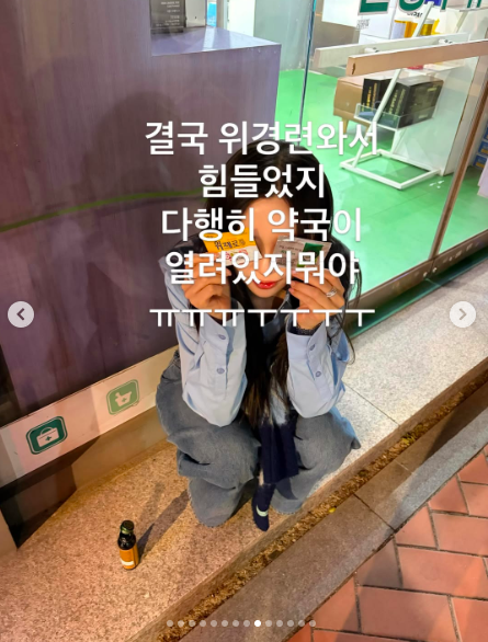 이어진 사진에는 이솔이가 곱창을 먹고 위경련이 오면서 다급하게 약국을 찾은 모습이 포착됐다. 문 앞에 쭈구려 앉은 그는 약을 들고서 ‘결국 위경련이와서 힘들었지. 다행이 약국이 열려있지 뭐야’라는 글을 전해 눈길을 끌었다.