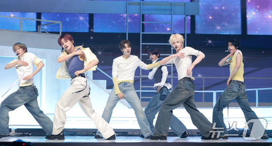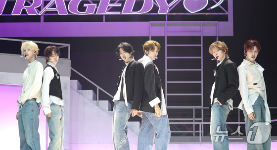 그룹 투어스(TWS)가 27일 오후 서울 광진구 예스24라이브홀에서 가진 미니 5집 ‘노 트레지디(NO TRAGEDY)’ 발매 기념 쇼케이스에서 타이틀곡 ‘널 따라가(You, You)’를 선보이고 있다. 2026.4.27 © 뉴스1 권현진 기자