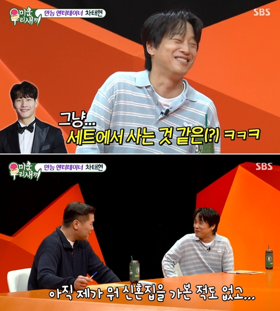 이에 신동엽은 "결혼하면 보통 집들이를 하는데 요즘은 잘 안 하지 않냐. 그게 없어서 가짜라고 생각하는 거냐"고 물었고, 차태현은 "그런 게 전혀 없다 보니까 더 믿기 어렵다"고 답했다.