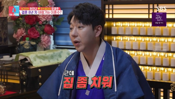 28일 방송된 '동상이몽 시즌2 – 너는 내 운명'에서는 개그우먼 허안나와 오경주 부부가 집 정리에 나서는 모습이 그려졌다. 그간 일이 잘 풀리지 않던 두 사람은 변화의 계기를 찾기 위해 '운명전쟁49' 1위 무당 윤대만 신당을 찾아가 점사를 보러 나섰고, 이 과정에서 집 상태에 대한 지적을 받게 됐다.