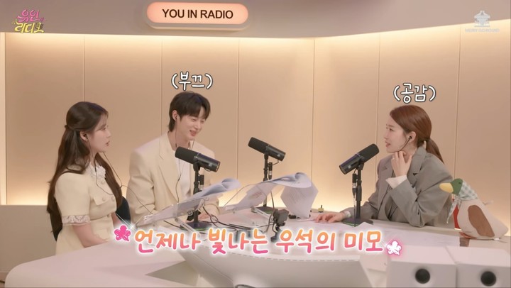 아이유의 추가 증언도 이어졌다. 그는 "우석씨랑 분장차에서 같이 헤어 메이크업을 받을 때도 있다. 그럴 때 아무 세팅이 안 된 상태의 우석씨도 많이 봤다"며 "우석씨는 거울을 보고 무너질 얼굴이 아니다"라고 말해 또 한 번 웃음을 안겼다.