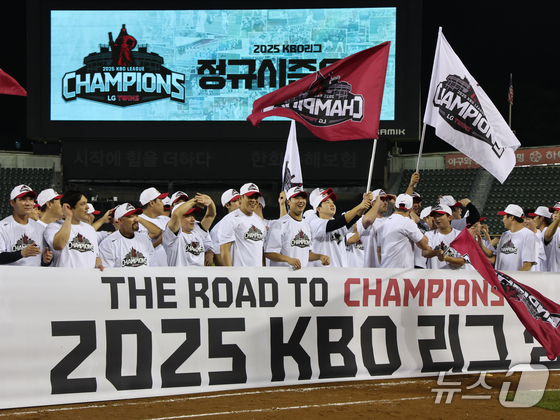 2년 만에 프로야구 정규시즌 우승을 확정한 LG 트윈스 선수들이 1일 서울 송파구 잠실야구장에서 우승 세리머니를 하고 있다. 한국시리즈에 직행한 LG는 구단 사상 4번째 통합우승에 도전한다. 2025.10.1/뉴스1 © News1 황기선 기자