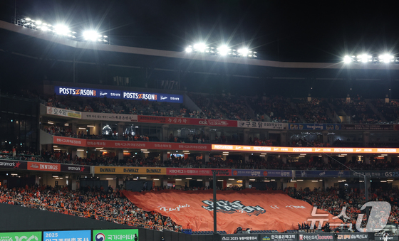 29일 대전 한화생명볼파크에서 열린 프로야구 2025 신한 SOL뱅크 KBO 포스트시즌 한국시리즈 3차전 LG 트윈스와 한화 이글스 경기에서 한화 펜들이 응원을 하고 있다. 2025.10.29/뉴스1 © News1 김기태 기자