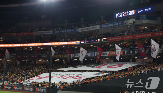 29일 대전 한화생명볼파크에서 열린 프로야구 2025 신한 SOL뱅크 KBO 포스트시즌 한국시리즈 3차전 LG 트윈스와 한화 이글스 경기에서 LG팬들이 응원을 하고 있다. 2025.10.29/뉴스1 © News1 김기태 기자