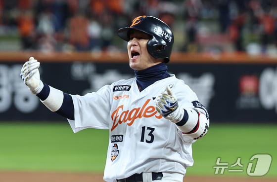 29일 대전 한화생명볼파크에서 열린 프로야구 2025 신한 SOL뱅크 KBO 포스트시즌 한국시리즈 3차전 LG 트윈스와 한화 이글스의 경기, 8회말 2사 2,3루 상황에서 한화 최재훈이 2타점 적시타를 치고 기뻐하고 있다. 2025.10.29/뉴스1 © News1 김도우 기자