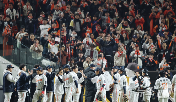 29일 대전 한화생명볼파크에서 열린 프로야구 2025 신한 SOL뱅크 KBO 포스트시즌 한국시리즈 3차전 LG 트윈스와 한화 이글스 경기에서 승리한 한화 선수들이 기뻐하고 있다. 2025.10.29/뉴스1 © News1 김기태 기자