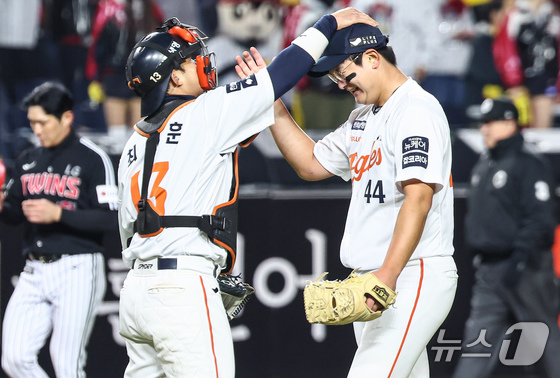 29일 대전 한화생명볼파크에서 열린 프로야구 2025 신한 SOL뱅크 KBO 포스트시즌 한국시리즈 3차전 LG 트윈스와 한화 이글스의 경기, 한화 마무리 투수 김서현이 9회초를 무실점으로 마치고 포수 최재훈과 기쁨을 나누고 있다. 2025.10.29/뉴스1 © News1 김도우 기자