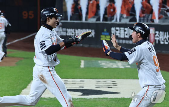 29일 대전 한화생명볼파크에서 열린 프로야구 2025 신한 SOL뱅크 KBO 포스트시즌 한국시리즈 3차전 LG 트윈스와 한화 이글스의 경기, 한화의 8회말 2사 2,3루 상황 최재훈의 2타점 안타로 심우준(왼쪽)이 홈인하며 황영묵과 하이파이브 하고 있다. 2025.10.29/뉴스1 © News1 구윤성 기자