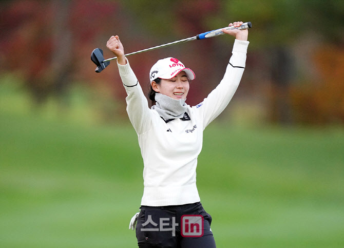 황유민이 9일 경기 파주시 서원힐스 컨트리클럽에서 열린 KLPGA 투어 시즌 최종전 대보하우스디 챔피언십에서 4차 연장 끝에 우승을 확정한 뒤 기뻐하고 있다. (사진=이데일리 골프in 조원범 기자)