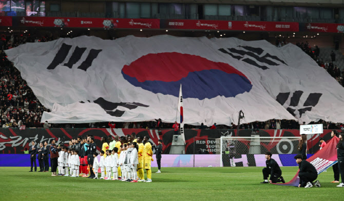 18일 서울 마포구 서울월드컵경기장에서 열린 남자축구 국가대표 A매치 평가전 대한민국과 가나의 경기. 한국 선수와 관중들이 애국가를 부르고 있다. 사진=연합뉴스