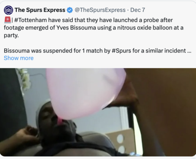 비수마의 일탈은 처음이 아니다. 그는 지난해 8월 시즌 개막을 앞두고 소셜 미디어 계정에 풍선을 흡입하는 영상을 직접 게시했다. 프리시즌 마지막 경기를 치른 뒤 과음한 상태에서 벌인 행동이었다. 여론이 들끓자 그는 “영상에 대해 사과한다. 심각한 판단 부족이었다. 위험성을 알고 있다. 선수이자 롤모델로서 책임을 무겁게 느낀다”고 고개를 숙였다. 당시 토트넘은 그에게 1경기 출전 정지를 부과했다.