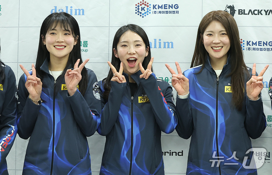 2일 오후 서울 송파구 서울올림픽파크텔에서 열린 '2025 밀라노-코르티나담페초 동계올림픽 & 동계패럴림픽 컬링 국가대표 출정식'에 참가한 여자 컬링 대표팀의 설예은(왼쪽부터), 김수지, 설예지가 행사가 끝난 뒤 카메라를 보며 포즈를 취하고 있다. 2026.1.2/뉴스1 © News1 김진환 기자