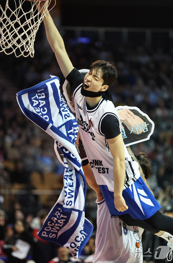18일 오후 서울 송파구 잠실실내체육관에서 열린 2025-2026 LG전자 프로농구 올스타전 덩크슛 콘테스트에서 서울 삼성 조준희가 눈을 가리고 덩크슛을 성공 후 기뻐하고 있다. 2026.1.18/뉴스1 © News1 김도우 기자