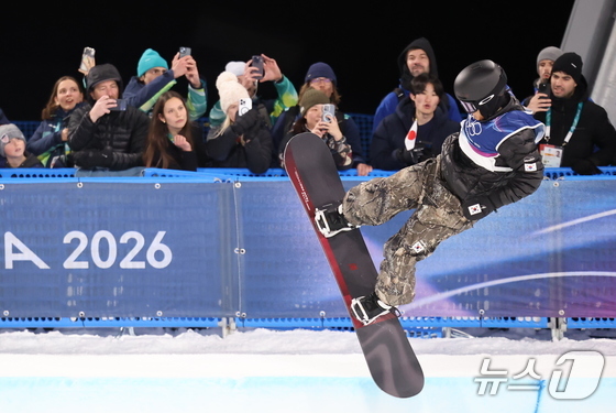 스노보드 이채운이 13일(현지시간) 이탈리아 리비뇨 스노파크에서 열린 2026 밀라노·코르티나담페초 동계올림픽 스노보드 남자 하프파이프 결선에 출전해 경기를 펼치고 있다. 2026.2.14 © 뉴스1 김진환 기자