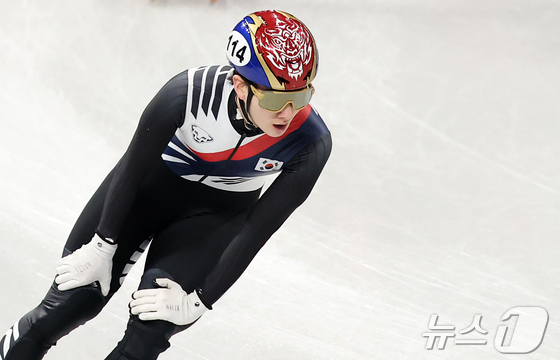 쇼트트랙 황대헌이 14일(현지시간) 이탈리아 밀라노 아이스 스케이팅 아레나에서 열린 2026 밀라노·코르티나담페초 동계올림픽 쇼트트랙 남자 1500m 준결승에서 질주하고 있다. 황대헌은 2위로 결승 진출에 성공했다. 2026.2.15 © 뉴스1 김진환 기자