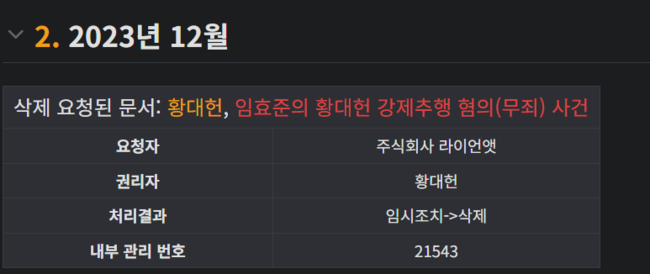 실제로 이번이 처음은 아니다. 나무위키 투명성 보고서에 따르면 황대헌 측은 해당 사안과 관련해 지속적으로 삭제를 요청해 왔다.