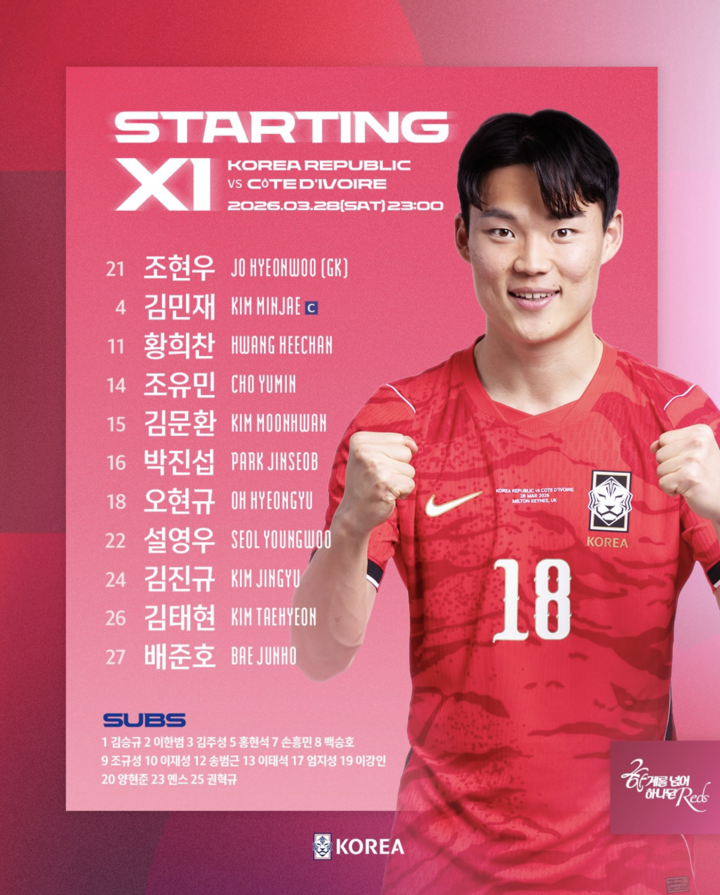 현재로선 북중미 월드컵에서도 손흥민과 함께 최전방을 책임질 선수로 가장 유력하게 전망되고 있는 가운데, 코트디부아르를 상대로 해결사 면모를 보여줄 수 있을지 오현규의 발끝에 뜨거운 관심이 쏠리고 있다.