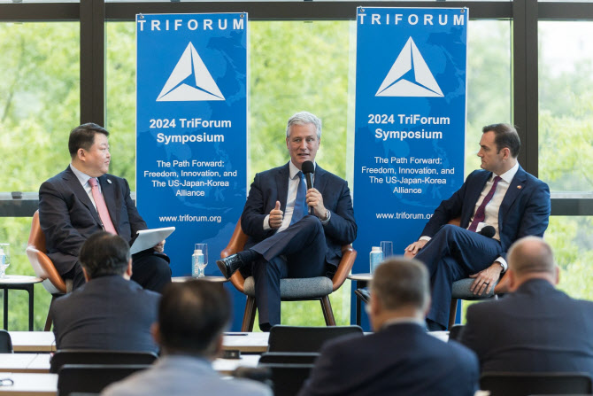 로버트 오브라이언 전 백악관 국가안보보좌관(사진 가운데)이 ‘트라이포럼 미국 심포지엄’에서 마이크 갤러거 전 연방하원의원 등과 대담을 나누고 있다 (사진=트라이포럼)