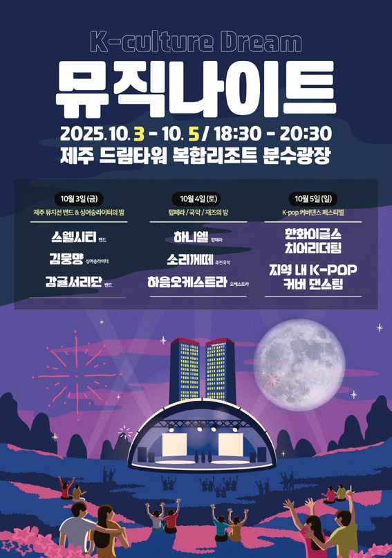 제주에서는 K-컬처 드림(K-Culture Dream) 뮤직나이트가 개최한다. 제주 드림타워 복합리조트 내 그랜드 플라자(분수 광장)에서 오는 10월 3일부터 5일까지 사흘간 오후 6시 30분부터 오후 8시 30분까지 진행된다. 가요, 팝페라, 오케스트라, 퓨전국악, K-POP 커버댄스 등 다양한 공연을 선보일 예정이다. 제주도민, 내외국인 관광객이 자유롭게 즐길 수 있도록 무료로 진행된다.