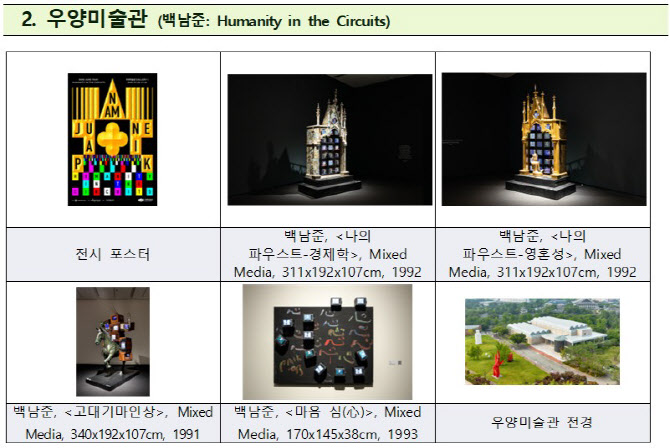 백남준은 과학 기술을 단순한 도구가 아닌 인간의 확장을 실현하는 매개체로 인식한다. 기술과 예술이 상호 작용하는 ‘유기적 회로’로서의 세계관을 구축했다. 이번 전시에서는 복원 과정을 거쳐 처음 공개하는 소장품인 ‘나의 파우스트’ 시리즈 중 ‘나의 파우스트·경제학’과 ‘나의 파우스트·영혼성’을 포함해 ‘기술과 예술, 인간’의 관계를 탐구한 주요 소장품을 한데 모은 것이 특징이다. 1990년대 백남준의 작업을 다층적으로 조망하고, ‘에이펙’이 제시하는 ‘연결과 혁신’을 사유할 수 있는 장을 제공한다.