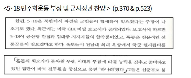 사회적 합의가 완결된 5·18 민주화운동에 대해서도 ‘CIA 보고서에 따르면, 5·18이 공산당 간첩과 김대중 지지자들의 합작품이었고, 폭동은 전문적인 선동꾼들이 일으켰다고 한다’라며 무분별한 음모론을 제기했다. 12·12 사태를 일으킨 하나회를 두고는 ‘혼돈의 회오리가 몰아칠 무렵, 시대의 부름에 따를 능력을 갖추고 준비하고 있던 집단이 바로 전두환을 중심으로 뭉친 하나회였다’며 포장하는 등 군사독재 미화를 넘어 찬양하는 서술이 다수 확인됐다.