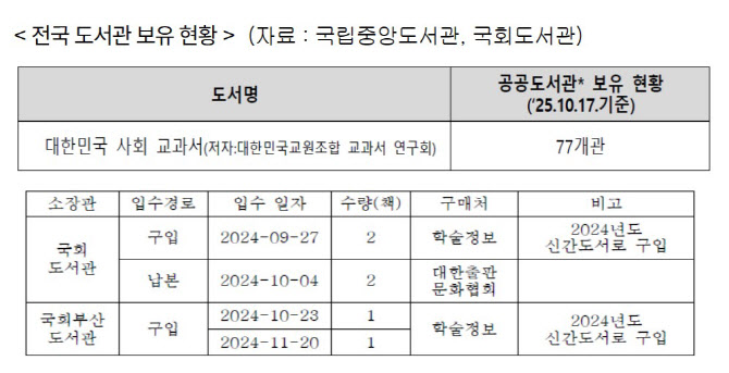 22일 국회 문화체육관광위원회 박수현 더불어민주당 의원이 국립중앙도서관으로부터 제출받은 자료에 따르면, 식민사관과 독재 미화를 노골적으로 드러내는 도서 ‘대한민국 사회 교과서’를 전국 79개 공공도서관이 소장하고 있는 것으로 확인됐다.