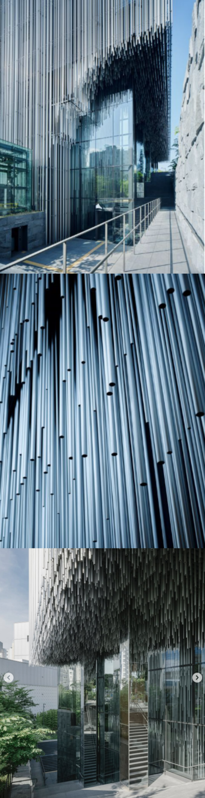 오디움 건축의 백미는 단연 알루미늄 파이프를 활용한 파사드이다. 얇고 긴 알루미늄 파이프를 불규칙적으로 배열하여, 마치 숲속 나뭇잎 사이로 햇살이 스며드는 듯한 모습을 시각적으로 구현했다. 이 파사드는 시간과 계절의 변화에 따라 시시각각 다른 빛을 머금으며 건물 자체가 자연의 질감을 닮은 감각적 공간이 되도록 한다.