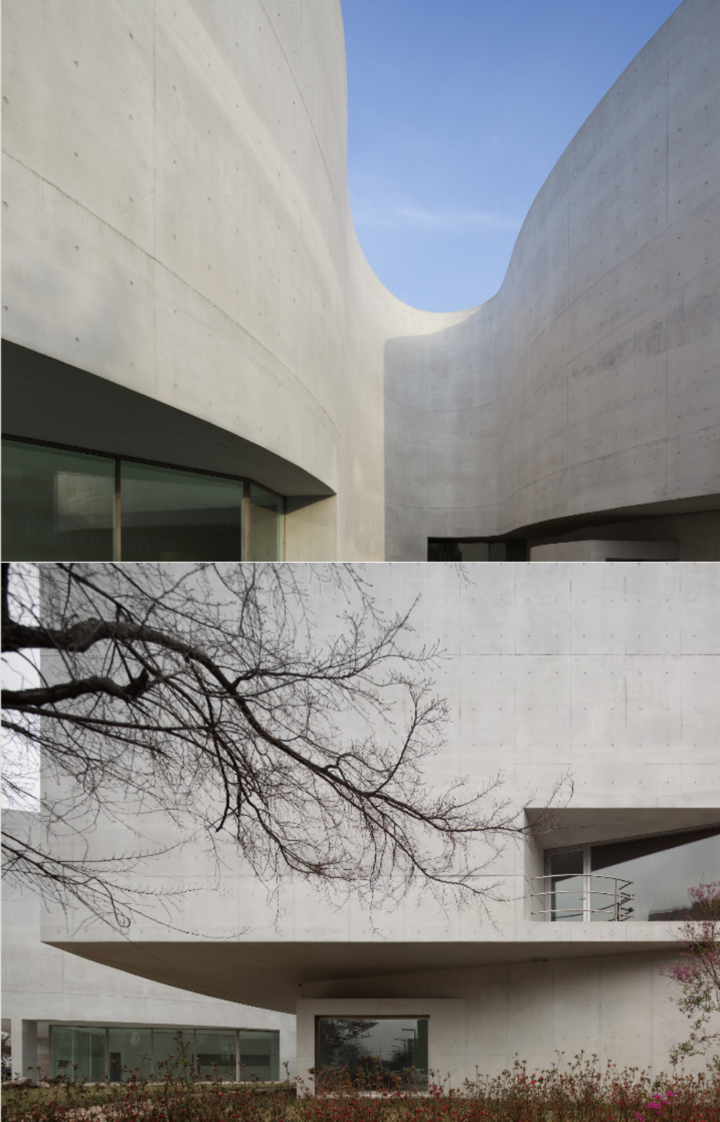 미술관의 외관은 두 개의 거대한 회백색 콘크리트 덩어리가 날개처럼 펼쳐진 형상이다. 장식이라곤 찾아볼 수 없는 육중한 상부의 벽면은 하부의 기둥 및 창과 극적인 대조를 이루며, 두 덩어리가 물결처럼 유연하게 연결되는 모습은 시자 건축 특유의 서정성을 보여준다.