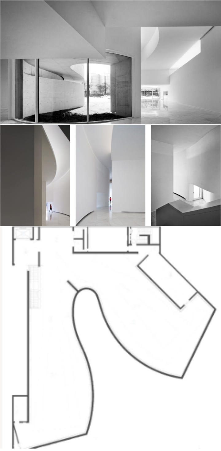 알비루 시자는 움직임을 통한 건축적 체험을 중시한다. 관람객은 나선형 계단과 램프를 따라 이동하며 직선과 곡선, 수직과 수평이 중첩되며 빚어내는 시선의 교차를 경험한다. 특히 U자형 곡면과 이중 천정이 조합된 3층 전시실은 가장 극적인 공간 체험을 제공하며 시자 건축의 정수를 느끼게 한다.