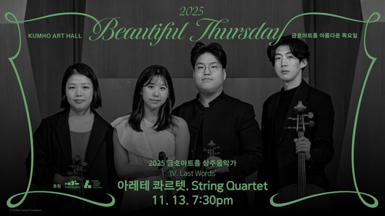 금호문화재단은 현악사중주단 아레테 콰르텟의 '라스트 워즈'(Last Words) 공연을 오는 13일 서울 서대문구 금호아트홀 연세 무대에 올린다. 이 4인방은올해 금호아트홀 상주 음악가로 선정돼 세 차례 무대를 가졌으며, 이번 공연은 그 활동의 마지막을 장식하는 무대다.