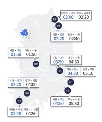 같은 기준 서울에서 지방 주요 도시까지의 예상 소요 시간은 △부산 4시간 50분 △울산 4시간 30분 △강릉 3시간 20분 △양양 2시간(남양주 출발) △대전 1시간 50분 △광주 3시간 20분 △목포 3시간 48분(서서울 출발) △대구 3시간 50분이다.
