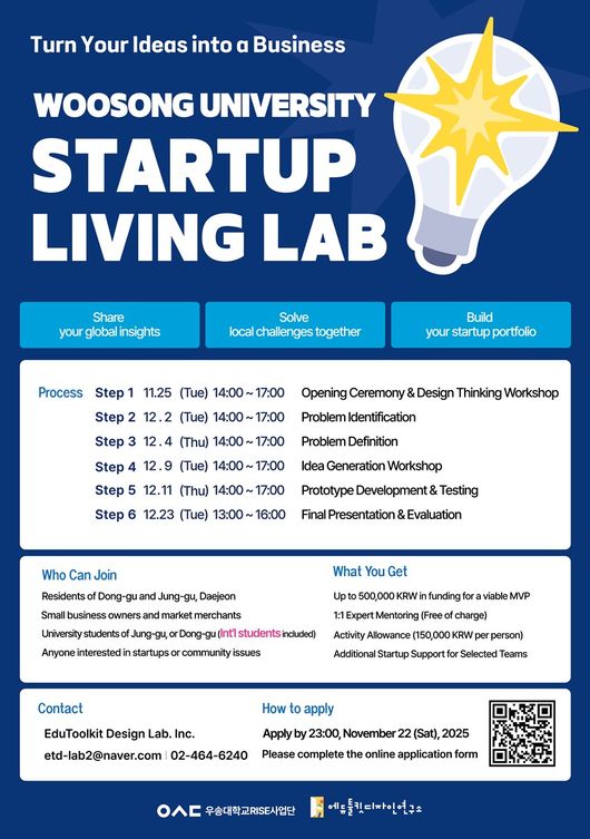 우송대학교 산학협력단 (단장 정병현)은 에듀툴킷디자인연구소 (대표 김성희)와 협력해 '지역주민 및 외국인 학생 창업 리빙랩' 참여자를 22일까지 모집한다고 17일 밝혔다. 대전 동구·중구를 중심으로 5개 팀(20명 이상)을 선발해 11월 말부터 12월 말까지 약 5주간 집중 프로그램을 운영한다.