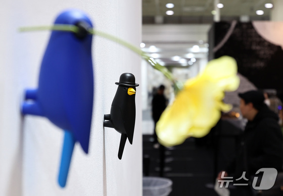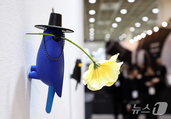 11일 서울 강남구 코엑스에서 열린 '2025 공예트렌드페어'에서 갓을 쓴 파랑새 오브제가 전시돼 있다. 2025.12.11/뉴스1 © News1 구윤성 기자