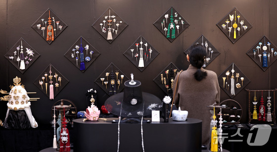 11일 서울 강남구 코엑스에서 열린 '2025 공예트렌드페어'에서 외국인 참관객이 갓과 노리개 등 수공예품을 살펴보고 있다. 2025.12.11/뉴스1 © News1 구윤성 기자