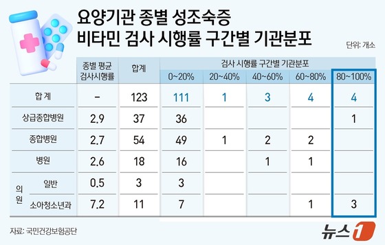 11일 뉴스1이 입수한 국민건강보험공단 '성조숙증에서 비타민 검사 과다 시행' 자료에 따르면 성조숙증 환자에게 비타민 검사를 청구한 의료기관은 지난해 기준 123곳이었다. 이 가운데 90.2%인 111개 기관의 시행률은 20% 미만으로, 대다수 기관은 지침에 맞춰 비필수 검사를 억제해 온 것으로 나타났다. 반면 시행률이 80% 이상인 기관이 4곳 있었고, 일부는 사실상 성조숙증 '진료=비타민 검사'가 관행화된 것으로 드러났다.