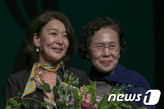 한국연극인복지재단 이취임식 행사에서 윤석화(왼쪽) 신임 이사장과 박정자 초대 이사장./뉴스1 © News1