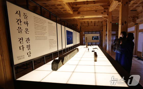 23일 오후 서울 종로구 경복궁 계조당에서 열린 특별전 '돌아온 관월당: 시간을 걷다' 개막 행사에서 방문객들이 전시물을 관람하고 있다. 관월당(觀月堂)은 왕실 관련 사당으로 추정되는 조선 후기 목조 건축물로, 일본에서 약 100년 만에 귀환한 관월당 주요 부재와 귀환 과정을 기록한 이번 전시는 24일부터 내년 1월 26일까지 경복궁 계조당에서 관람할 수 있다. 2025.12.23/뉴스1 © News1 오대일 기자