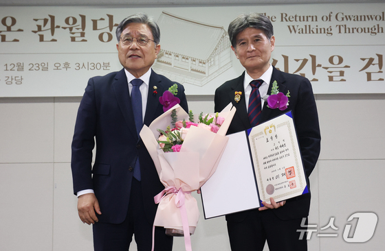 23일 오후 서울 종로구 국립고궁박물관에서 열린 '돌아온 관월당: 시간을 걷다' 특별전 개막식에서 관월당을 기증한 사토 다카오(佐藤孝雄) 일본 고토쿠인(高德院)의 주지가 허민 국가유산청장으로부터 대통령 표창을 받은 후 기념촬영을 하고 있다. 관월당(觀月堂)은 왕실 관련 사당으로 추정되는 조선 후기 목조 건축물로, 일본에서 약 100년 만에 귀환한 관월당 주요 부재와 귀환 과정을 기록한 이번 전시는 24일부터 2026년 1월 26일까지 경복궁 계조당에서 관람할 수 있다. 2025.12.23/뉴스1 © News1 오대일 기자